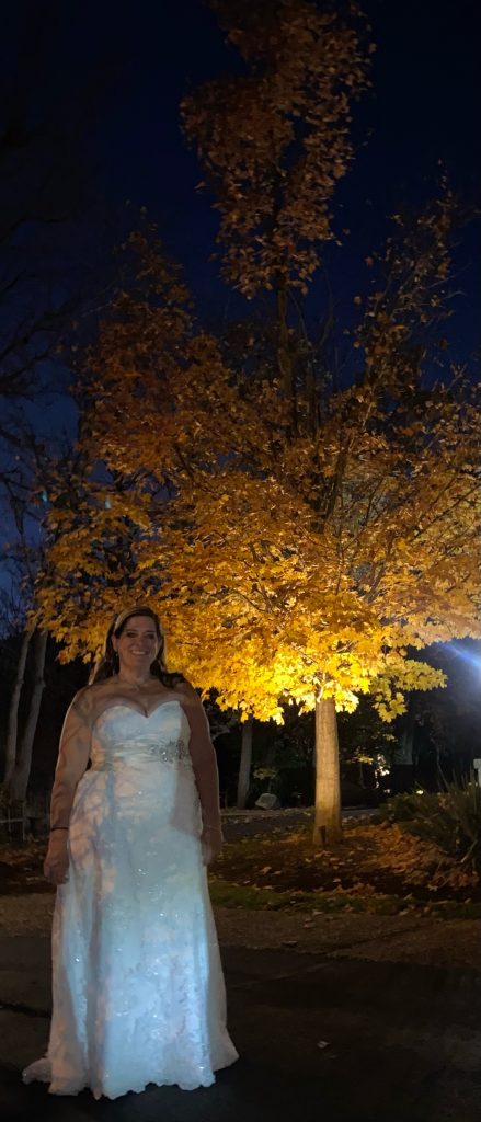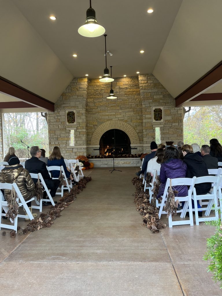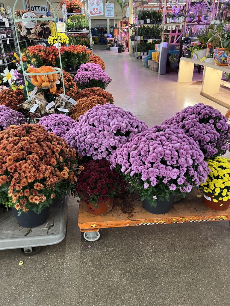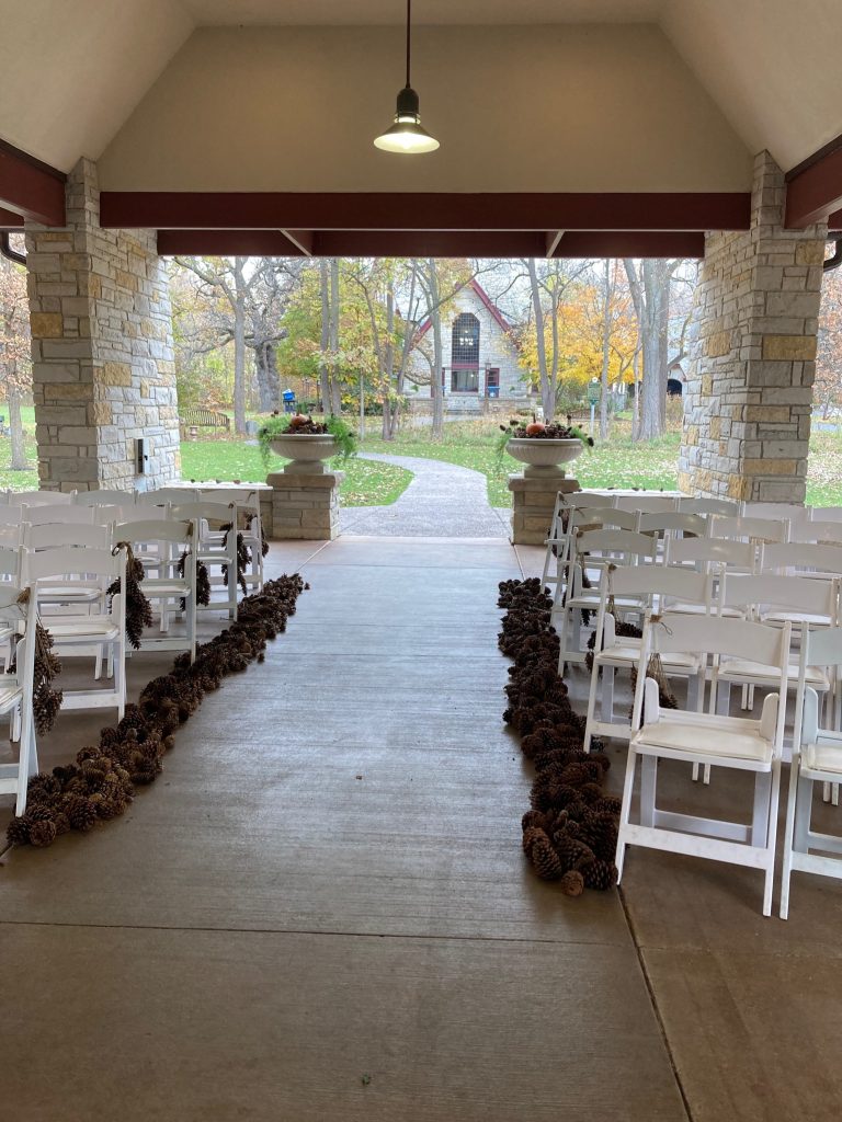 My SIL (Terry) arrived – there was now 2 people with me getting ready to celebrate and take care of last-minute stuff.  Just by chance we went to the venue; we had a freeze the night before and the vegetation was all DEAD.  Our goal of an outside wedding looked bleak; the beautiful venue looked NOT GREAT, and the venue was not sure they could do anything to make it look good.  I was freaking out – but then we stumbled up Jungle of Niles, a nursery near the venue and they were a LIFE SAVIOR.  They had HUGE mum plants, and the price was RIGHT and after I did some negotiating (that would make Catherine proud) we got an even better deal.  WOO HOO.